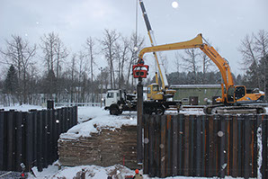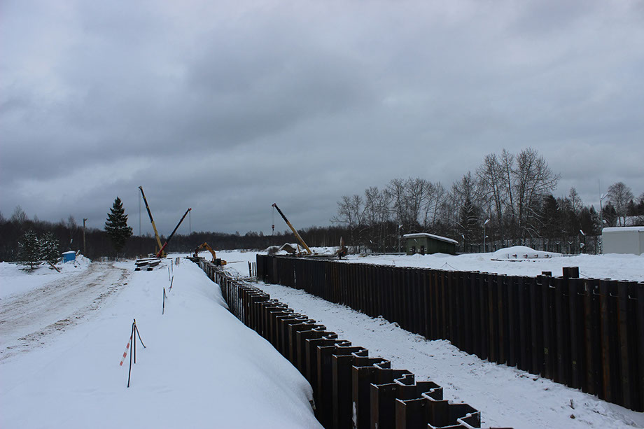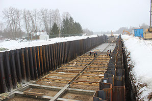 После забивки шпунта вибриропогружателем производится обратная засыпка участка (длиной 37 м и переменной шириной от 4 м до 1 м с уклоном откоса 1:1,5) песчаным грунтом с уплотнением и естественными откосами сопряжения с поверхностью дна.